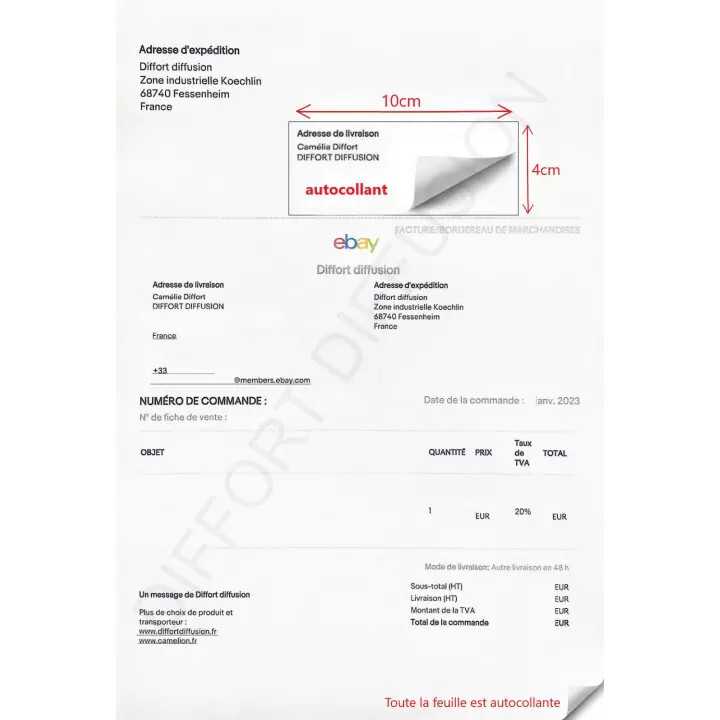 Vous pouvez retirer l'étiquette autocollante, la coller sur votre enveloppe et le reste de la feuillez peut être utilisée comme facture.