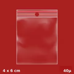Ce sachet plastique zippé 40x60 mm est idéal pour emballer, trier ou suspendre vos produits. Équipé d’un trou de suspension et d’un fin liseré rouge au-dessus de la fermeture zip, il est pratique et esthétique. Fabriqué en plastique 40µ, il remplace les anciens modèles 50µ : plus léger, plus écologique, tout aussi robuste.**Contenus adaptés :** - Bijoux - Visserie - Échantillons - Jetons