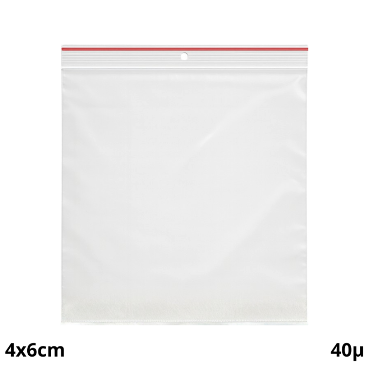 Sachet zip 40x60 mm avec trou de suspension et liseré rouge. Plastique 40µ, pratique et léger.
