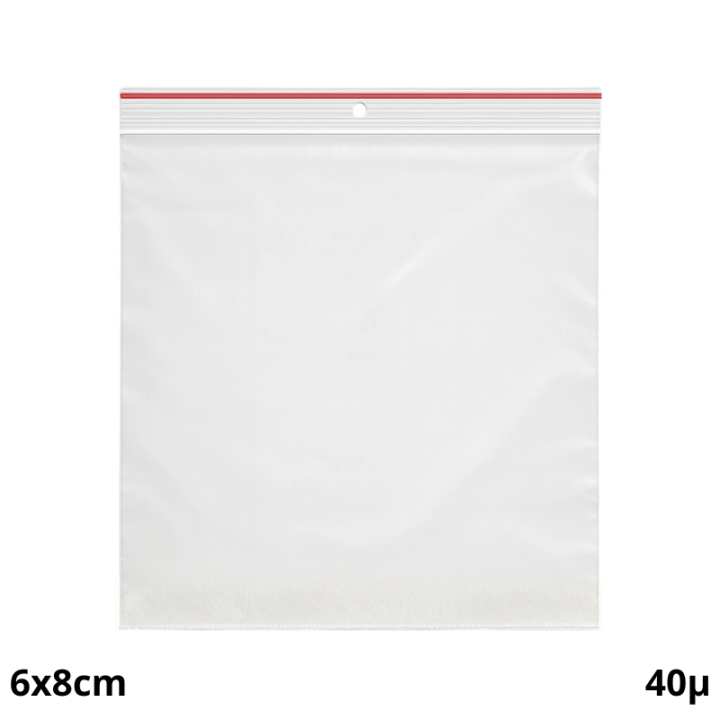 Sachet zip 60x80 mm avec trou de suspension et liseré rouge. Plastique 40µ, pratique et léger.