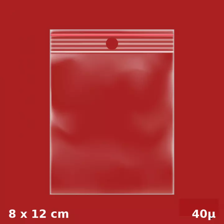 Ce sachet plastique zippé 80x120 mm est idéal pour emballer, trier ou suspendre vos produits. Équipé d’un trou de suspension et d’un fin liseré rouge au-dessus de la fermeture zip, il est pratique et esthétique. Fabriqué en plastique 40µ, il remplace les anciens modèles 50µ : plus léger, plus écologique, tout aussi robuste.**Contenus adaptés :** - Accessoires - Câbles - Mercerie - Petits jouets
