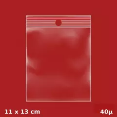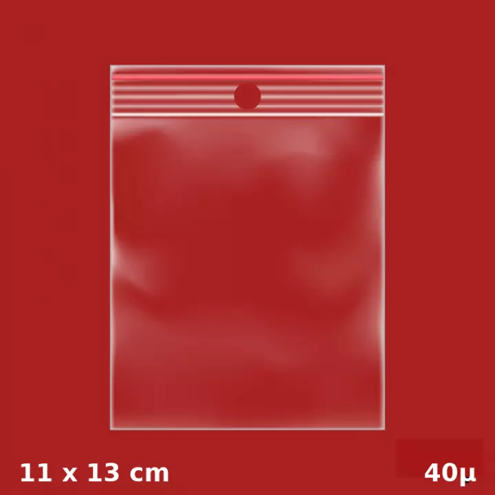 Ce sachet plastique zippé 110x130 mm est idéal pour emballer, trier ou suspendre vos produits. Équipé d’un trou de suspension et d’un fin liseré rouge au-dessus de la fermeture zip, il est pratique et esthétique. Fabriqué en plastique 40µ, il remplace les anciens modèles 50µ : plus léger, plus écologique, tout aussi robuste. **Contenus adaptés :** - Accessoires - Câbles - Mercerie - Petits jouets