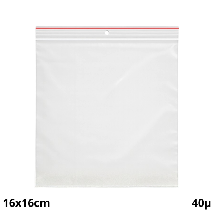 Ce sachet plastique zippé 160x160 mm est idéal pour emballer, trier ou suspendre vos produits. Équipé d’un trou de suspension et d’un fin liseré rouge au-dessus de la fermeture zip, il est pratique et esthétique. Fabriqué en plastique 40µ, il remplace les anciens modèles 50µ : plus léger, plus écologique, tout aussi robuste. **Contenus adaptés :** - Textile - Dossiers - Objets déco - Équipements légers