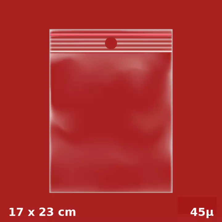 Ce sachet plastique zippé 170x230 mm est idéal pour emballer, trier ou suspendre vos produits. Équipé d’un trou de suspension et d’un fin liseré rouge au-dessus de la fermeture zip, il est pratique et esthétique. Fabriqué en plastique 45µ, il remplace les anciens modèles 50µ : plus léger, plus écologique, tout aussi robuste. **Contenus adaptés :** - Textile - Dossiers - Objets déco - Équipements légers