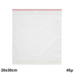 Sachet zip 200x300 mm avec trou de suspension et liseré rouge. Plastique 45µ, pratique et léger.