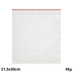 Sachet zip 215x300 mm avec trou de suspension et liseré rouge. Plastique 45µ, pratique et léger.